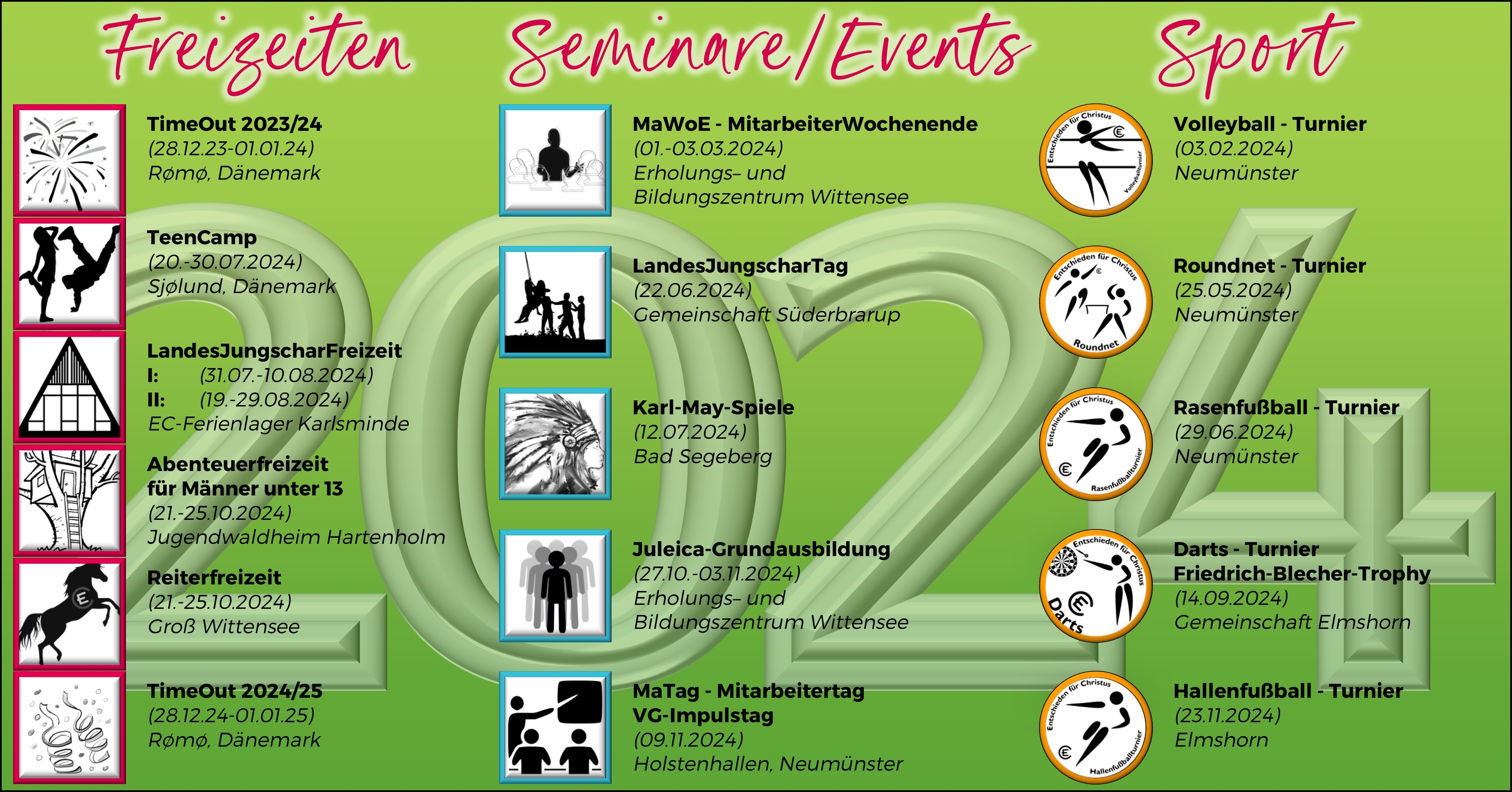 Endlich ist es so weit: Es gibt eine Terminübersicht des Nordbundes für 2024. Bitte berücksichtigt die Termine in euren örtlichen Terminplanungen. Wir freuen uns auf möglichst viele tolle Begegnungen mit euch.